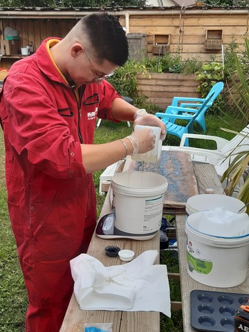 - La résine d'époxy, les calculs de volumes, la réalisation de coffrages et de moules, le choix de la pigmentation et de la coloration.