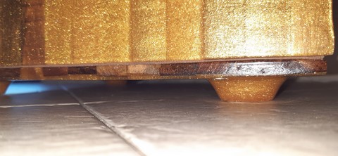 Elle est composée de plus de 850 lamelles de chêne, coulées dans de la résine d'époxy chargée de paillette dorées, certaines lamelles on étaient retirées pour permettre à la lumière de traverser la résine.